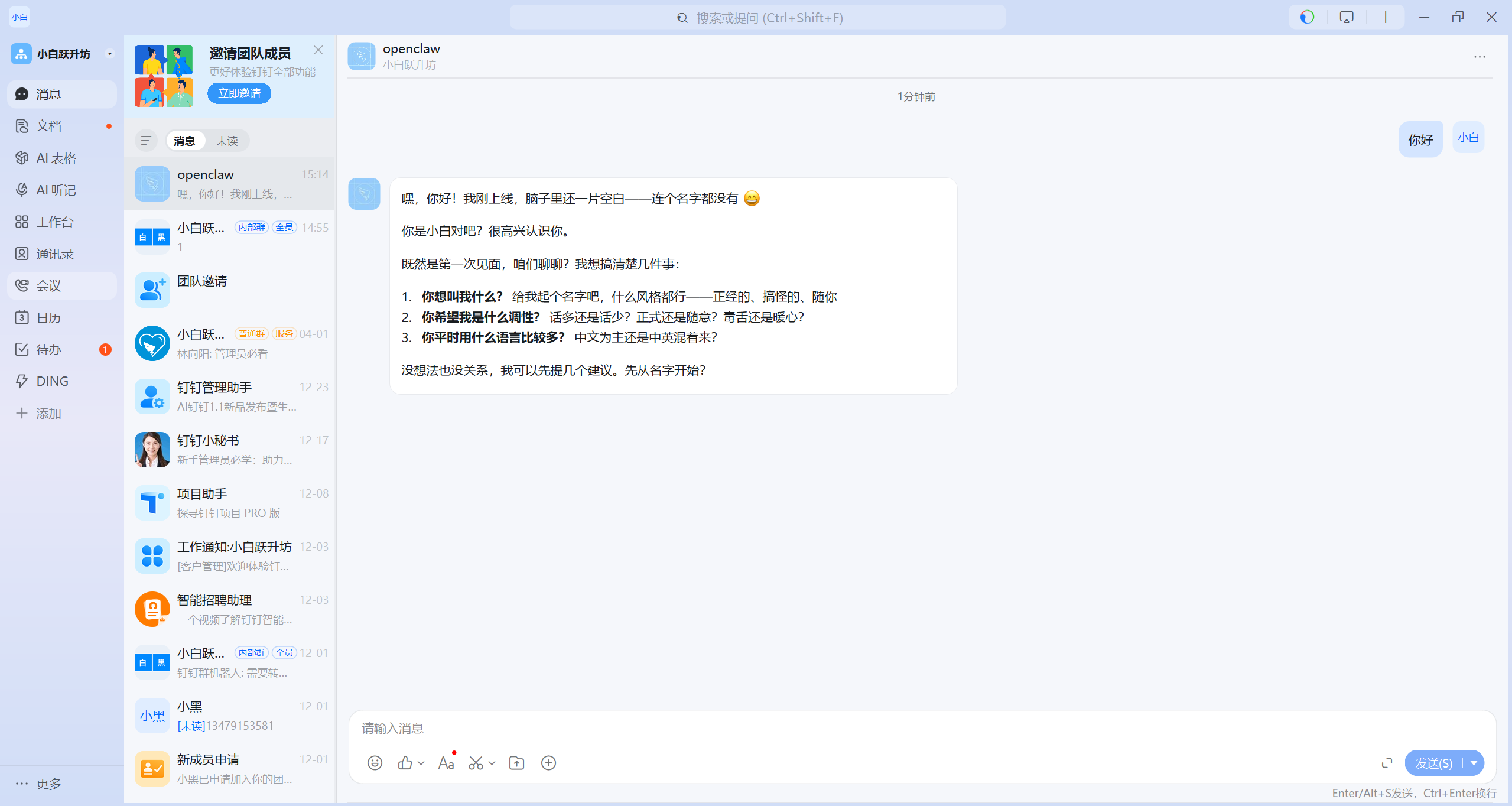 3、若能正常收到机器人的响应消息,则代表整个对接流程全部完成,OpenClaw 与钉钉的消息交互功能已成功实现。