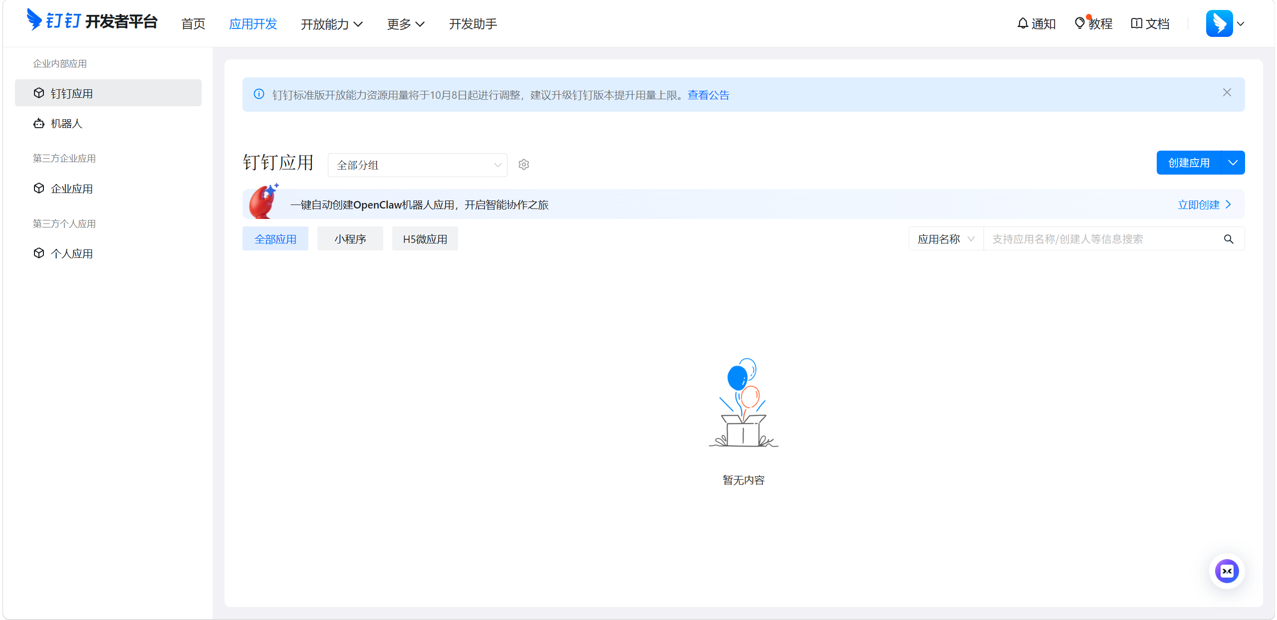 1、 访问钉钉开发者平台并登录,进入应用开发界面,选择企业内部应用进行创建。