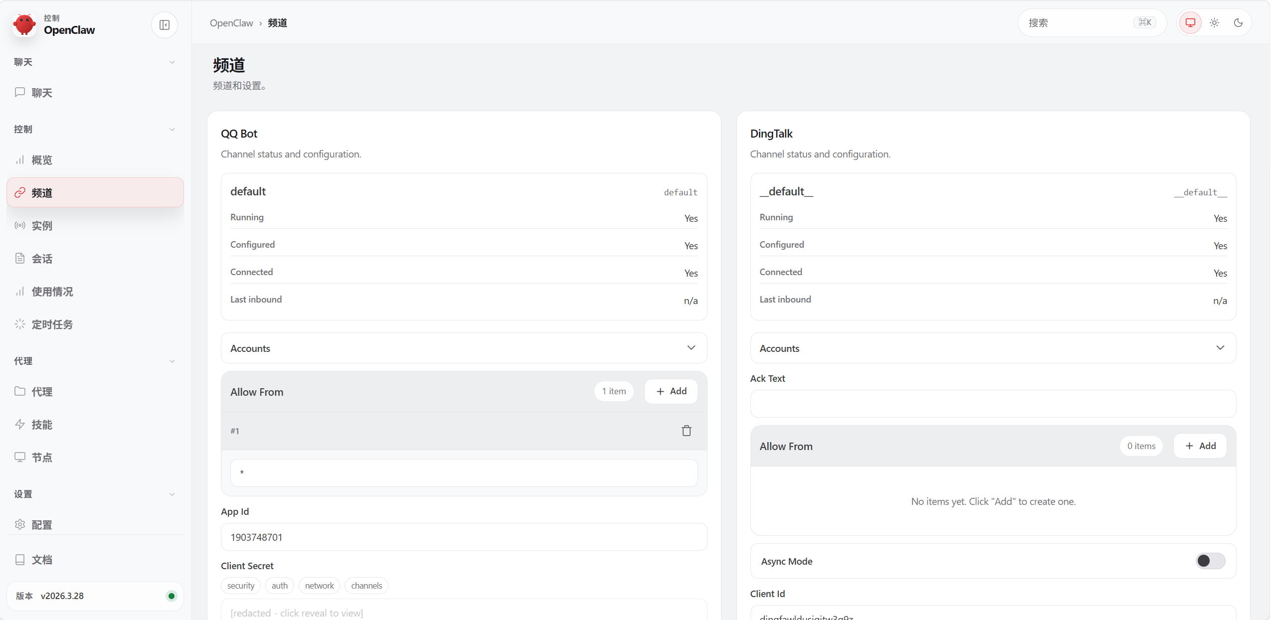 2、配置完成后点击保存,OpenClaw 与钉钉的连接已成功建立。