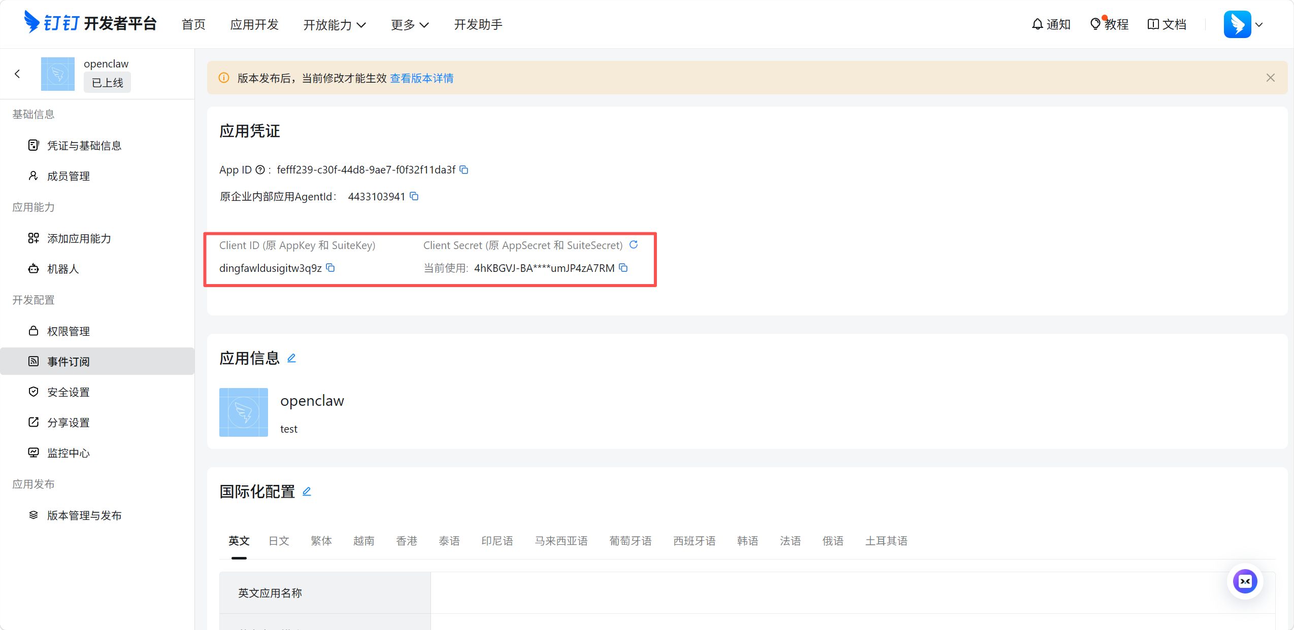 整个对接过程的关键在于钉钉应用必须选择Stream 模式并完成发布,同时准确获取并填写 Client ID、Client Secret 核心凭证。若出现配置失败的问题,可以通过OpenClaw对话式排查问题。