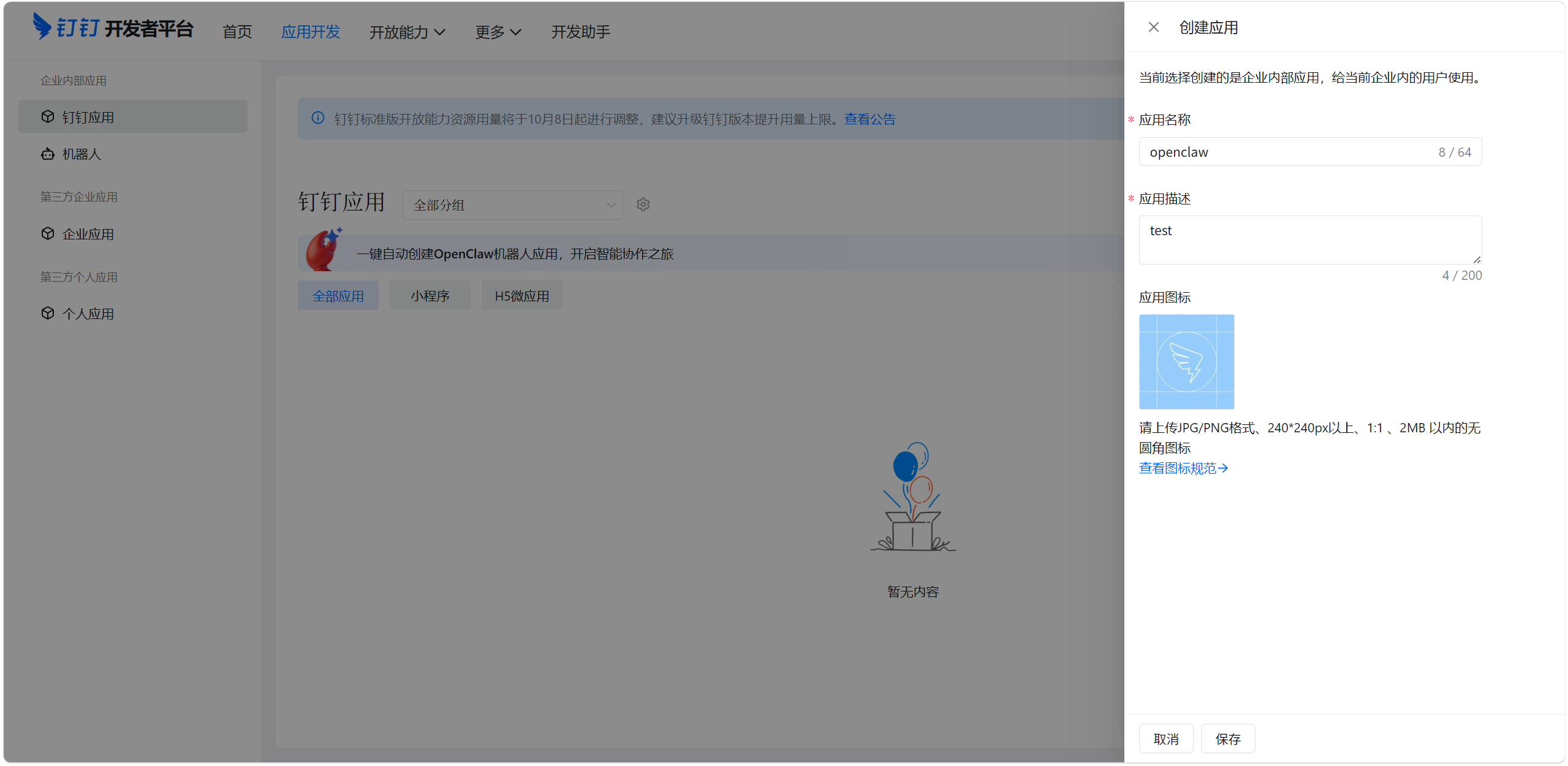 2、填写应用基础信息:应用名称设置为openclaw,应用描述和图标可根据需求自定义,完成后提交创建。