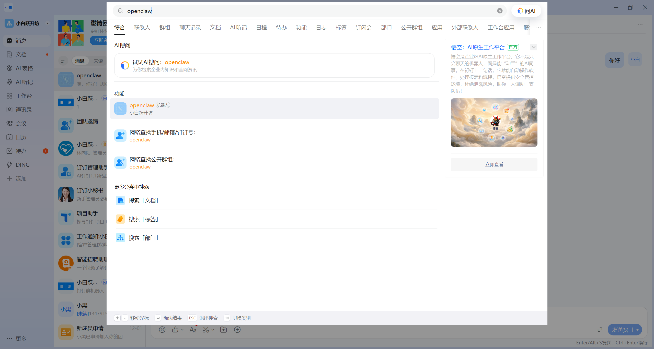 1、打开钉钉客户端,在顶部搜索栏输入openclaw,找到已创建的机器人应用并进入聊天界面。
