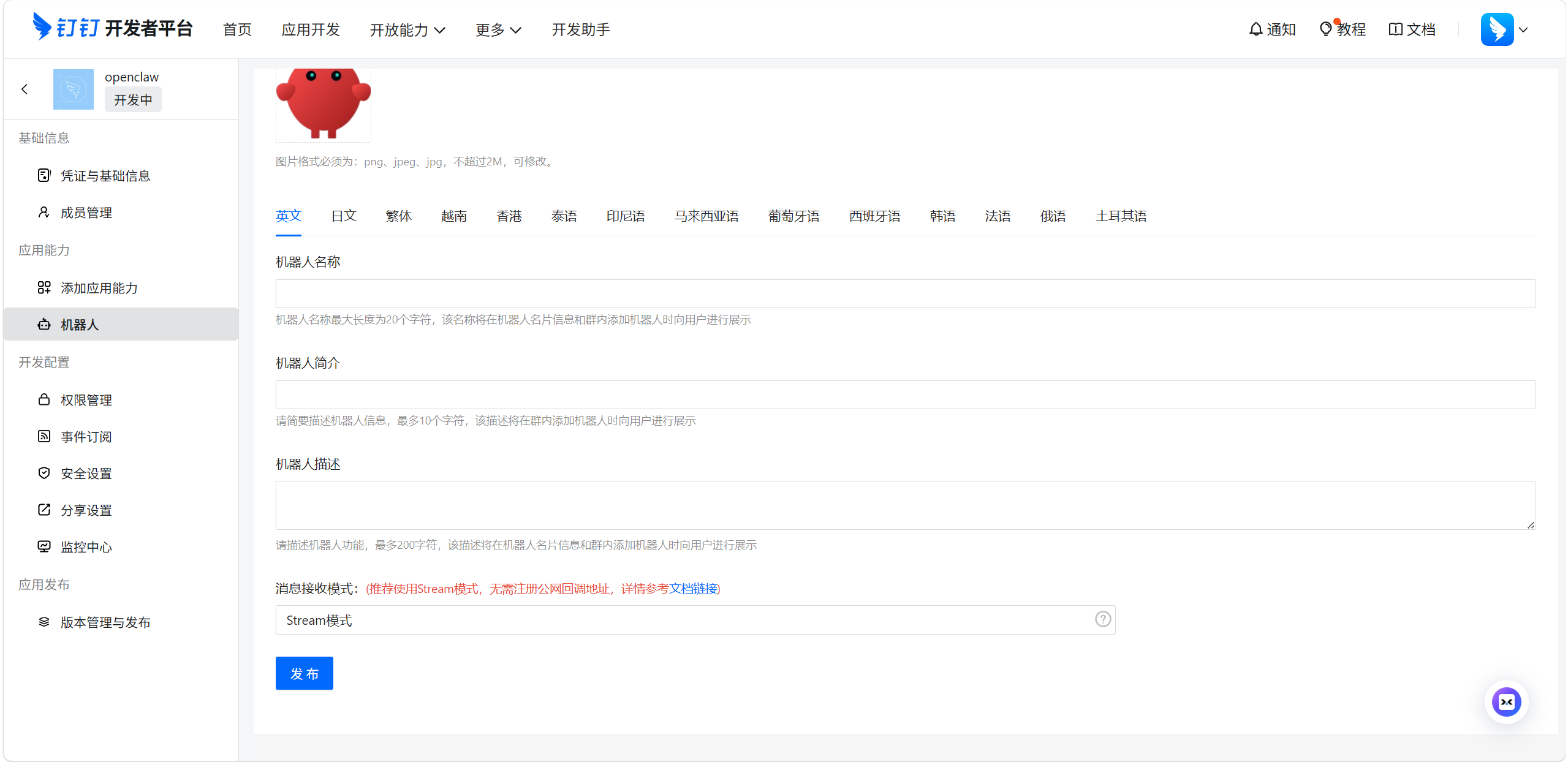 1、进入机器人配置界面,消息接收模式务必选择 Stream 模式,其余参数可根据需求自定义。