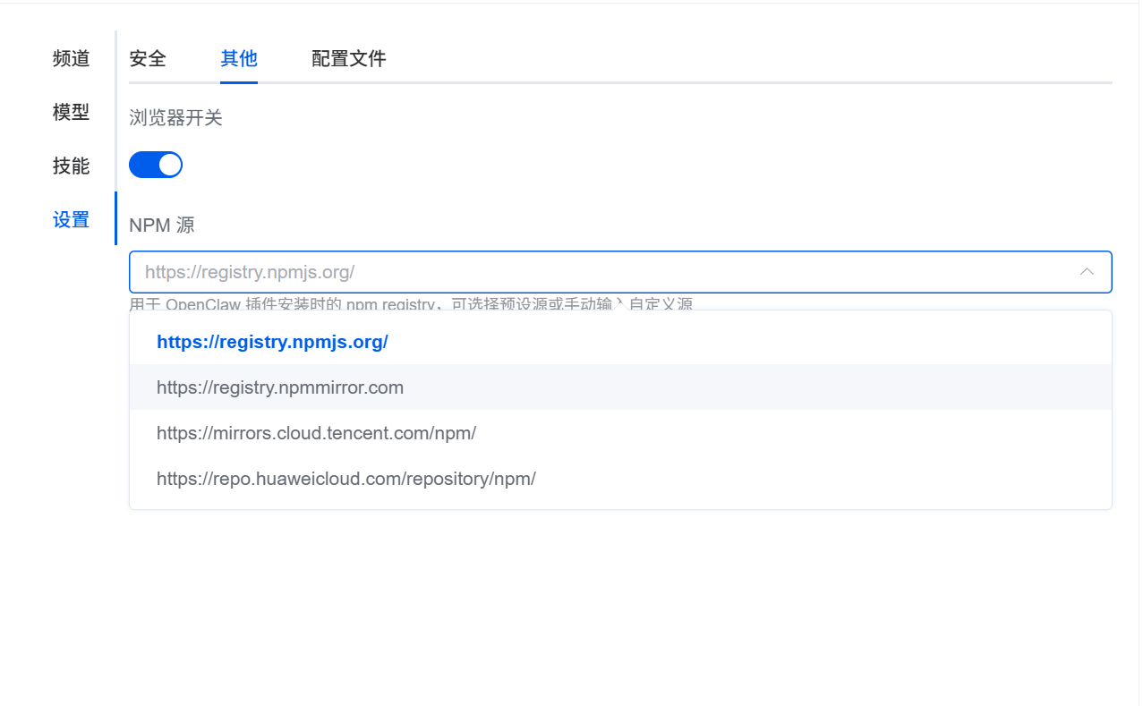 2.点击设置,选择其他,选择NPM源,国内用户推荐使用除第一个官方源之外的其他源进行下载
