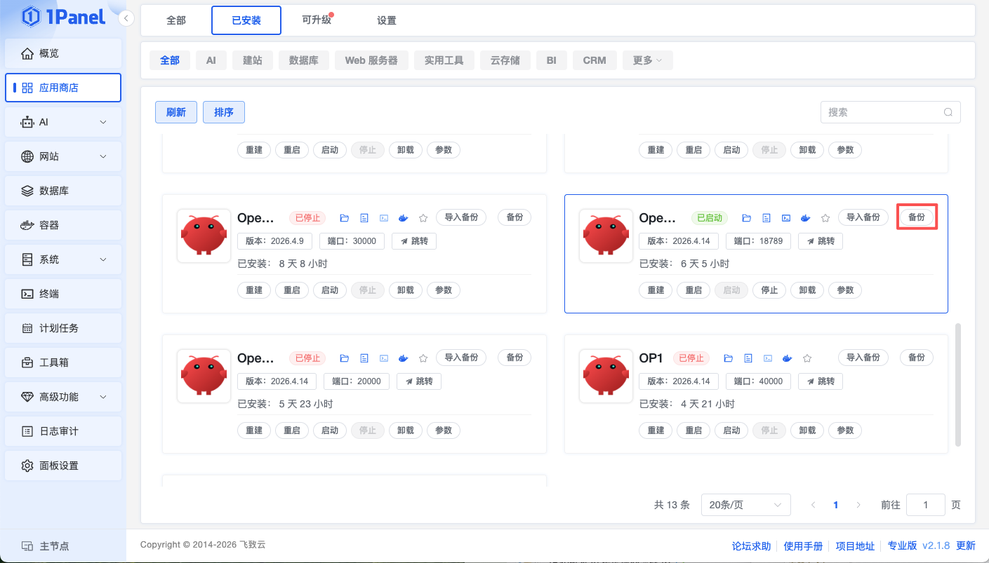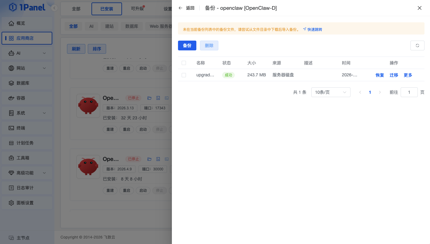 进入已安装应用,选择待备份的 OpenClaw 应用,然后点击备份手动创建新备份即可。