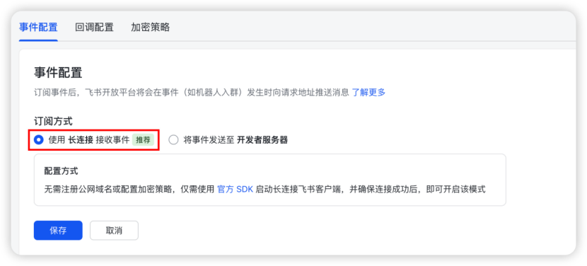 如下图所示,进入「事件与回调」菜单,分别完成订阅方式设置以及事件添加。