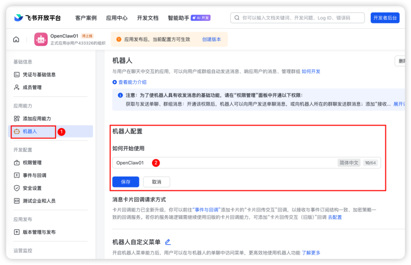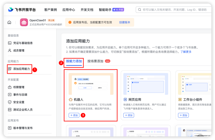 本文介绍如何基于1Panel完成OpenClaw的飞书渠道对接。配置飞书渠道我们首先需要在飞书中创建一个可用的机器人,参照如下步骤逐步完成即可。