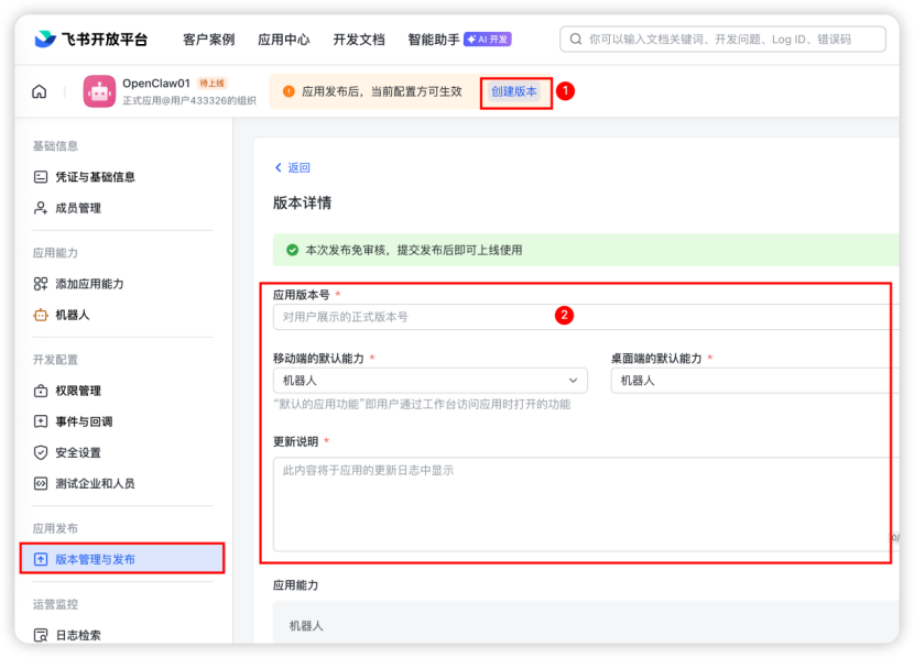 确认完成后点击「创建版本」,然后根据要求输入版本相关信息并发布,个人账号无需审批,企业账号需要进行企业审批。