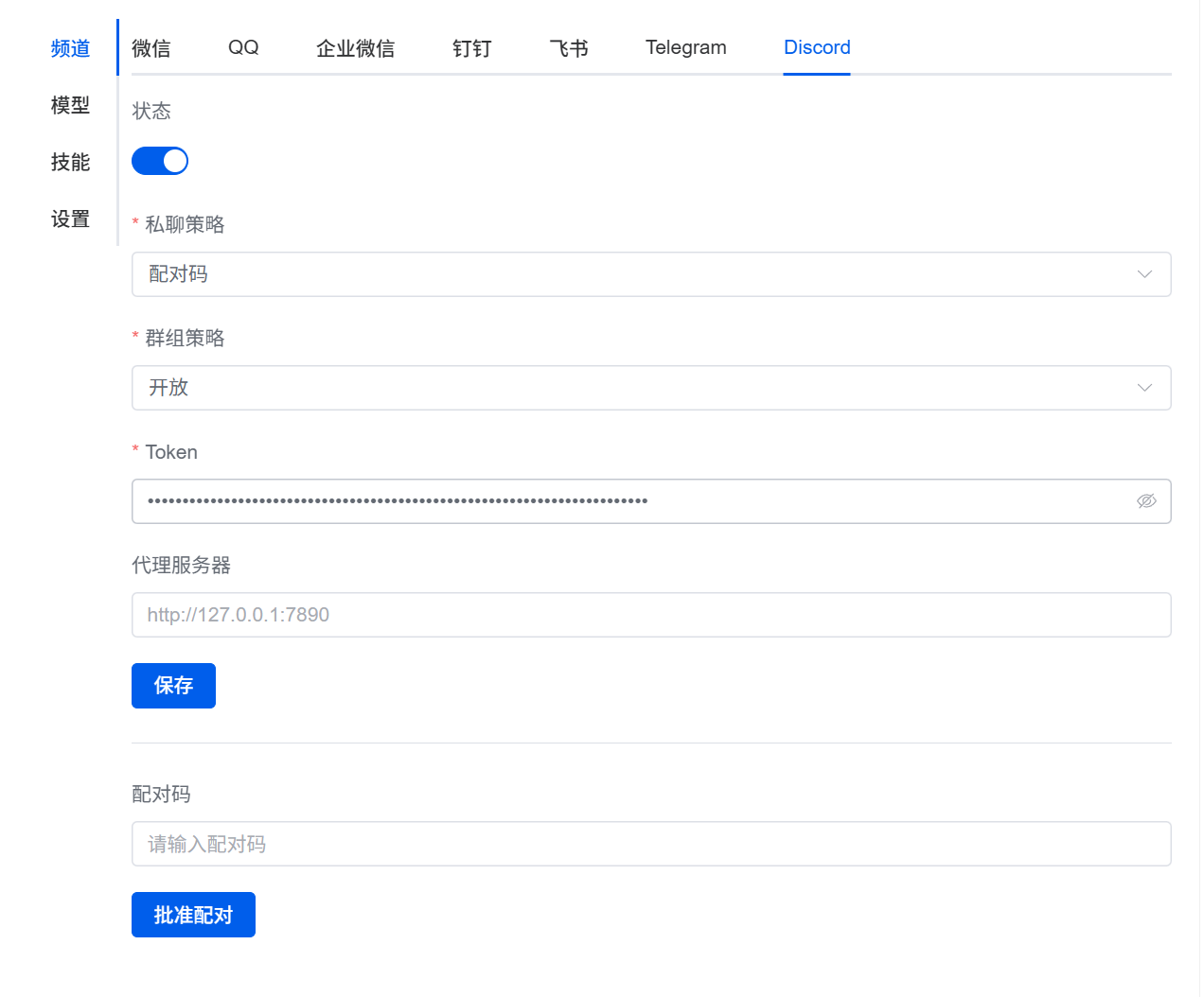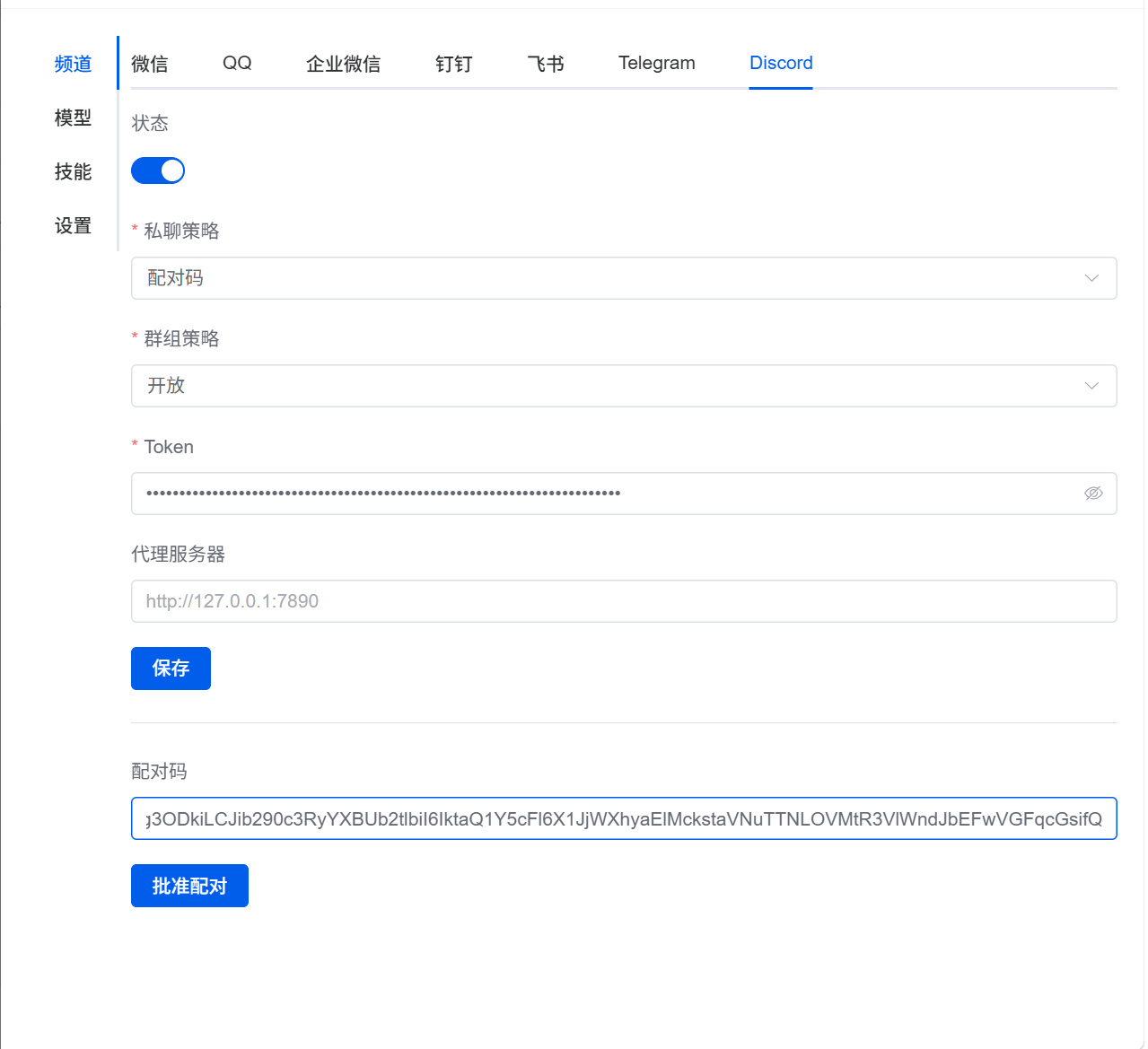 Token:粘贴步骤 2 中从 Discord 开发者平台复制的机器人 Token(核心必填项,粘贴时注意不要有多余空格)。
