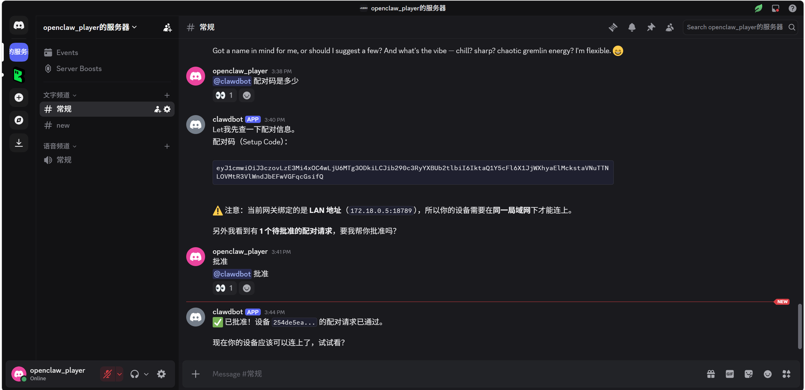也可以在 Discord 中直接让机器人处理配对请求,直接配对。