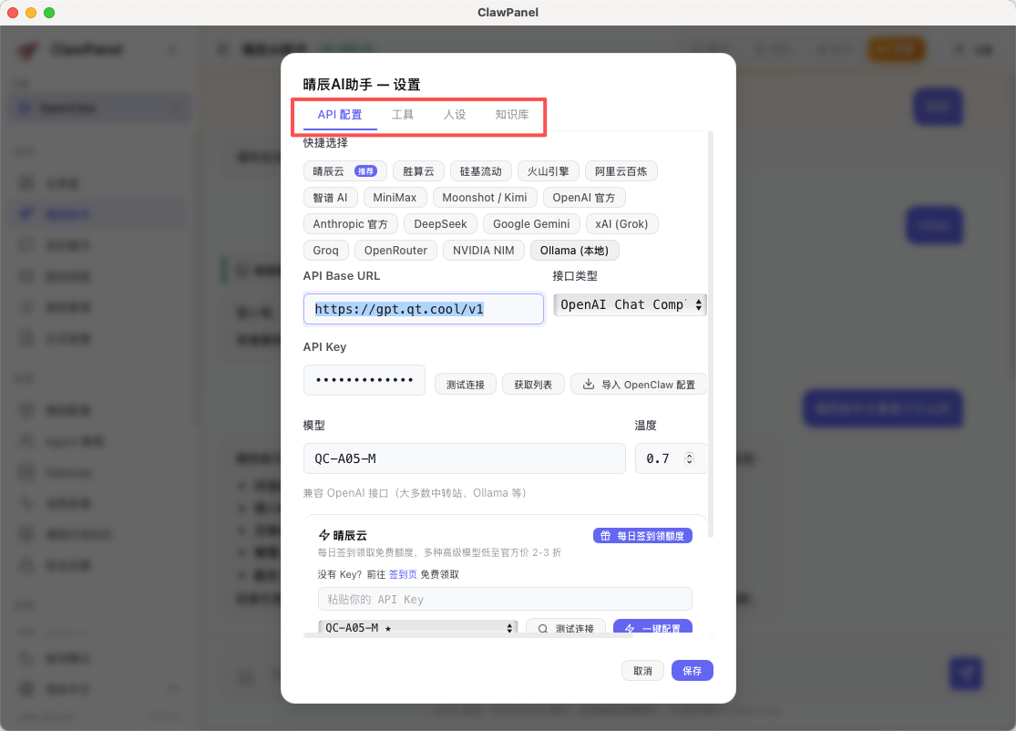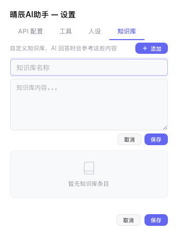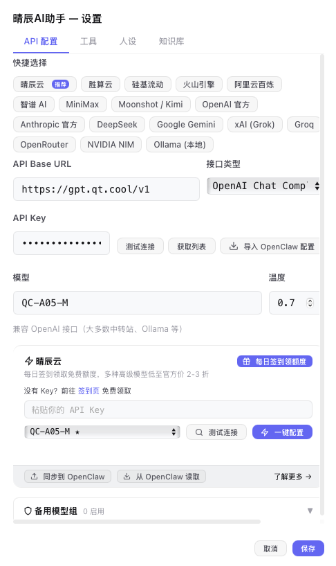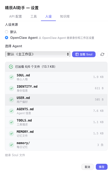 其中接管 OpenClaw 和 Hermes Agent 后,同时也支持晴辰 AI 助手,其可以单独配置模型、工具、人设以及知识库等,具体参见如下图所示,其中人设可以直接读取 OpenClaw 的 Soul、user 等文件设置。