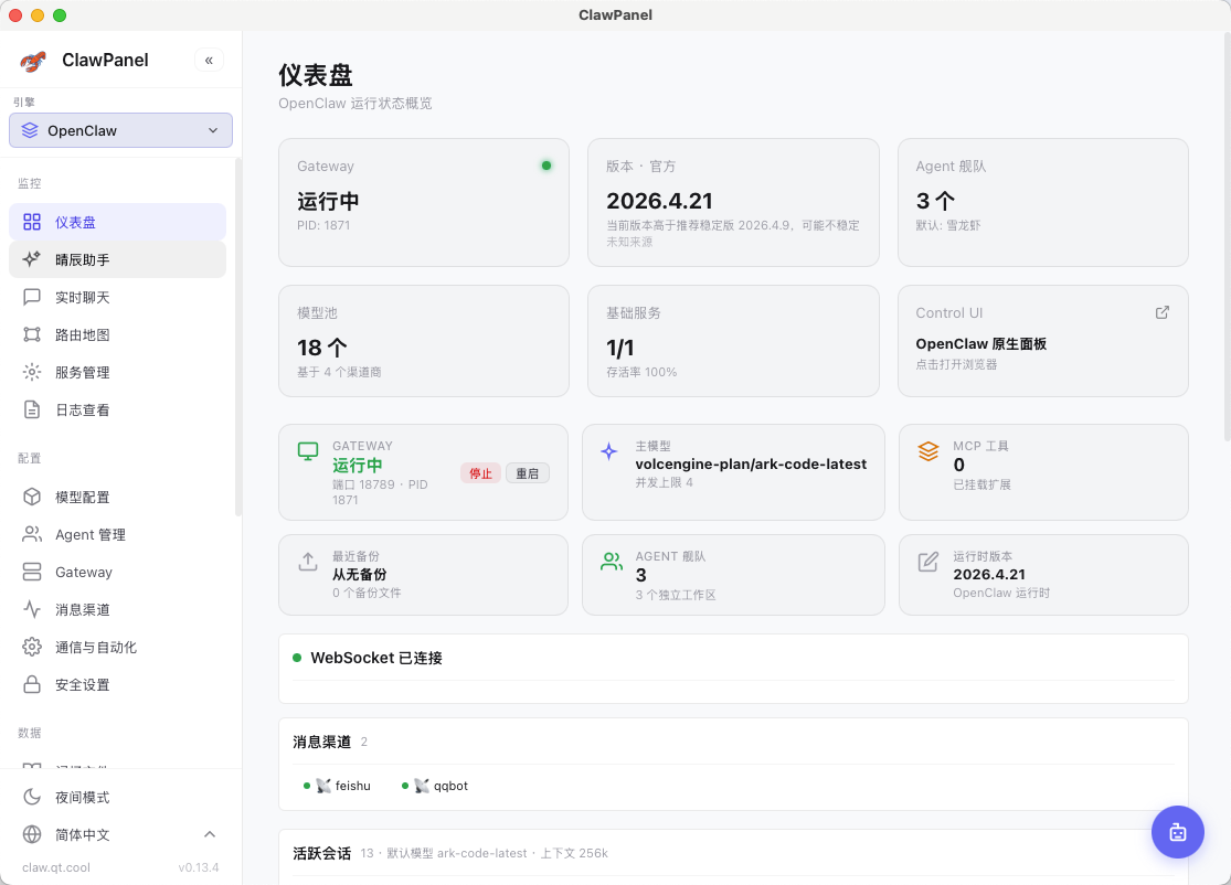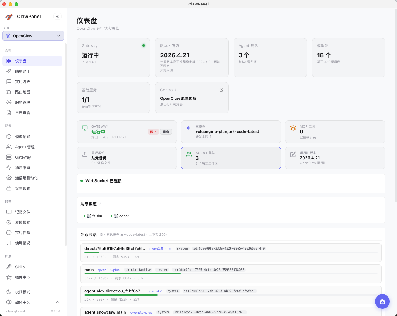 仪表板展示当前 OpenClaw Gateway 的运行状态以及其他基本信息,同时展示消息渠道、活跃会话以及最近日志等,同时也支持重启Gateway、检查更新以及创建备份,具体参见如下图所示: