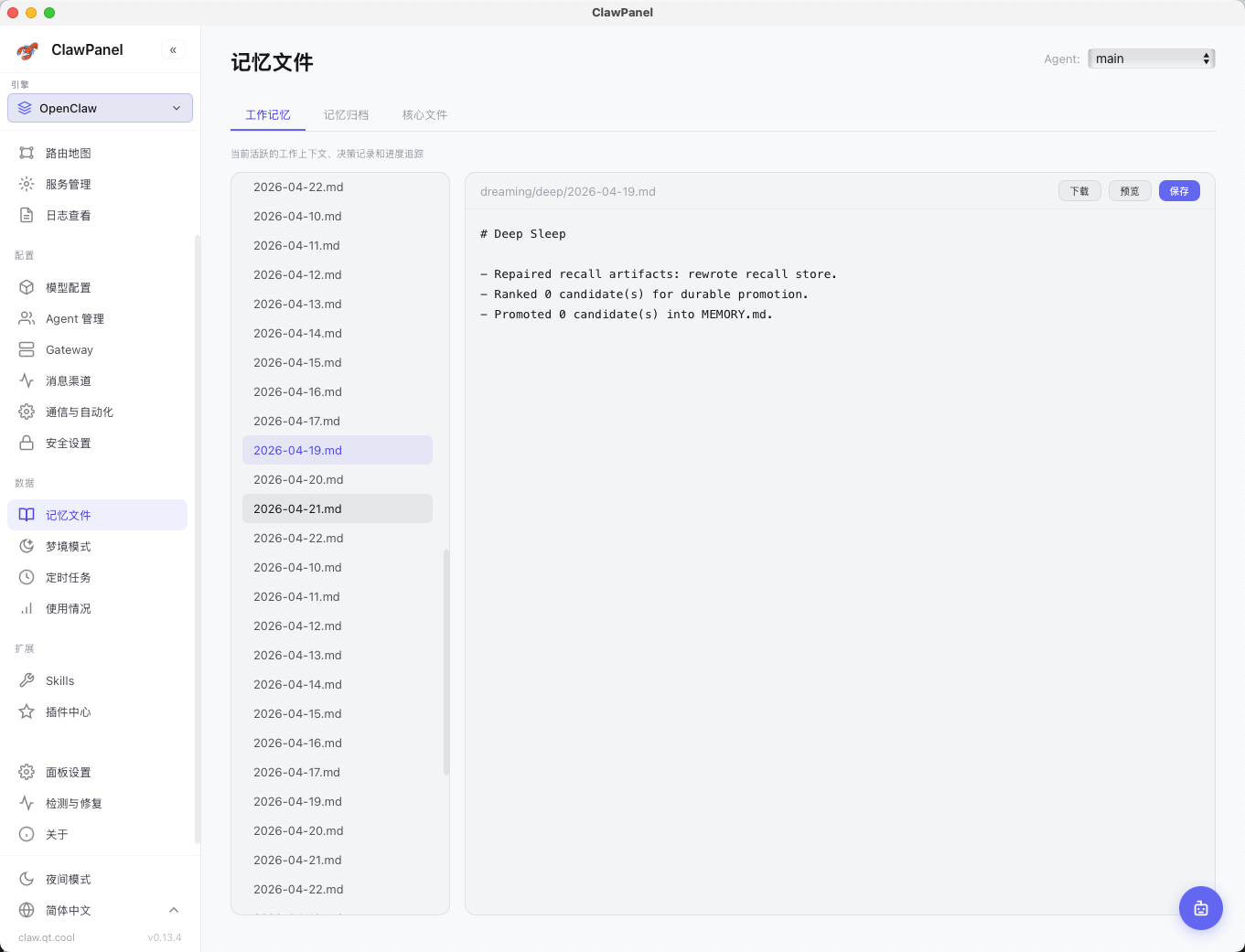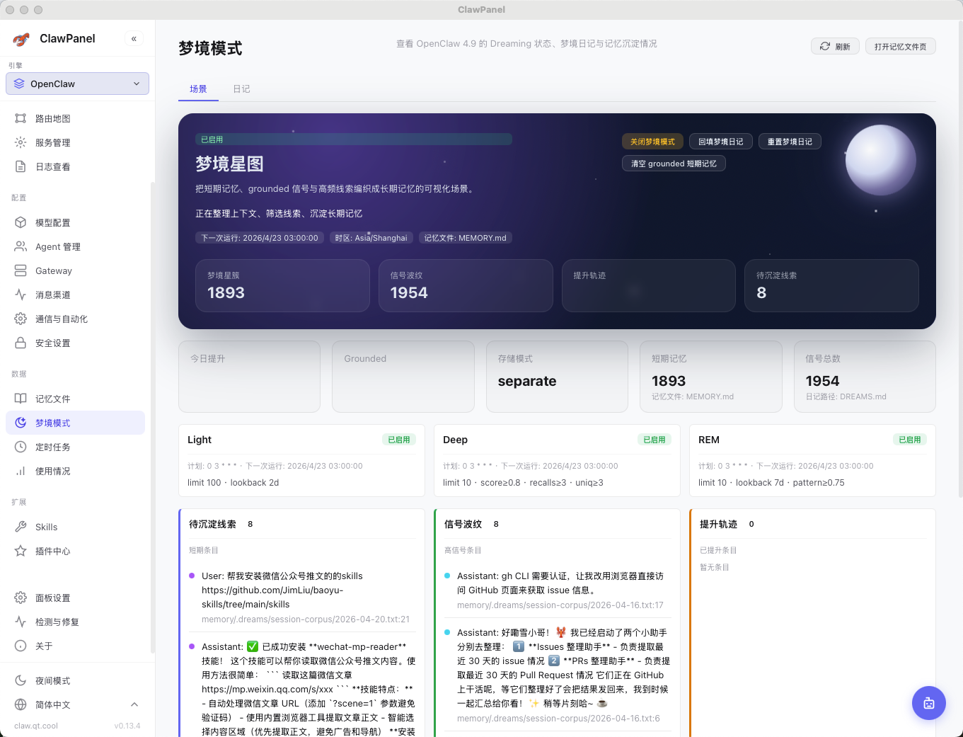 梦境模式,对应 OpenClaw 的梦境,分别按照场景和日记展示