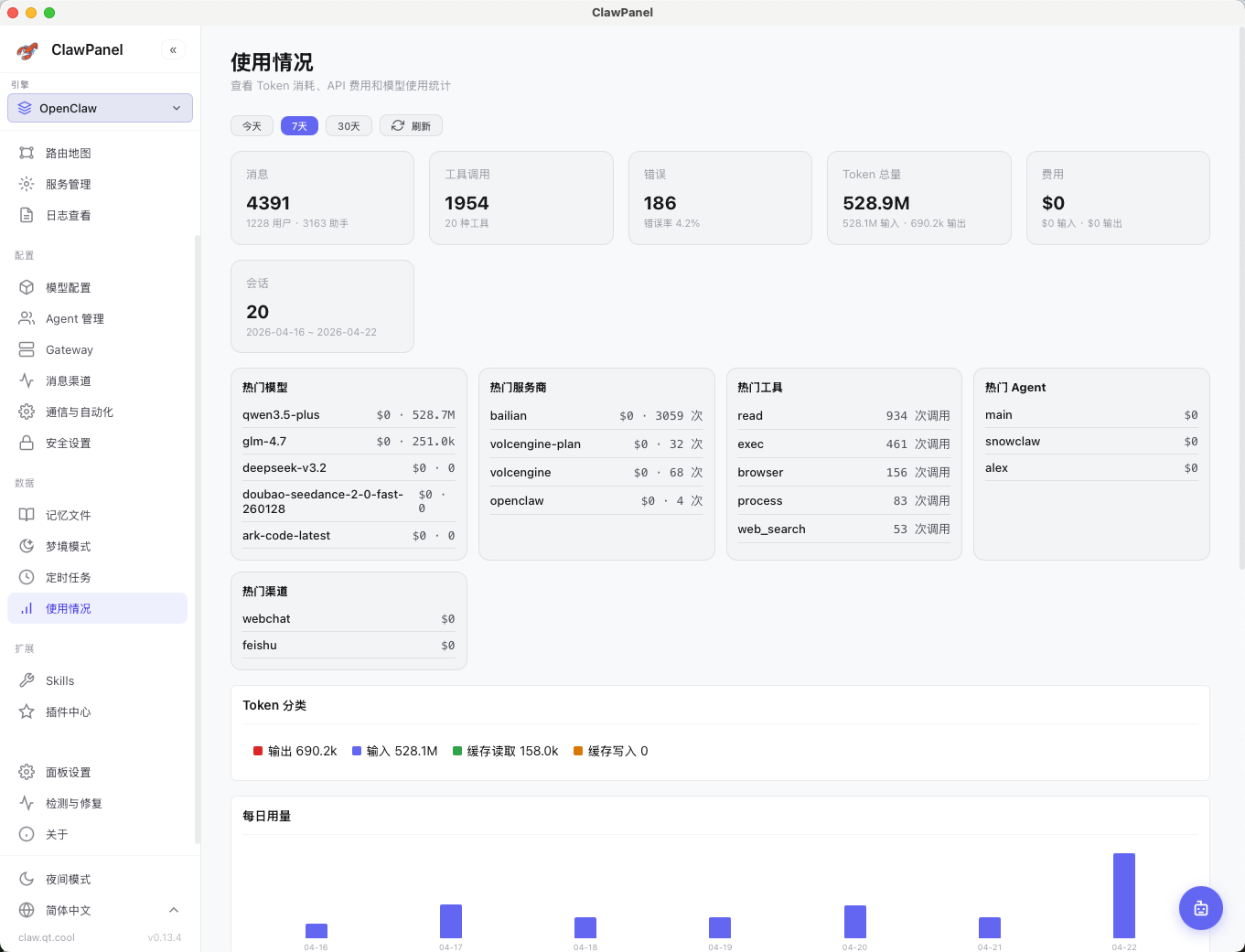 使用情况对应 OpenClaw 的Token使用情况,可以快速通过仪表板查看。