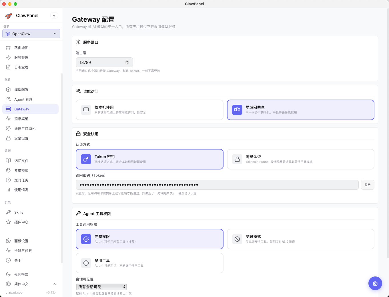 Gateway的配置,包括端口号、谁能访问、安全认证token、Agent工具权限以及会话可见性等,均可以配置。同时可以通过高级配置完成 Tailscale 组网配置。