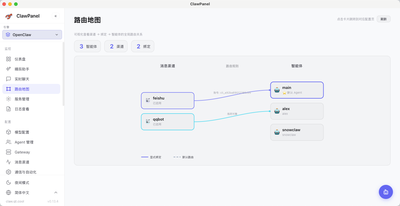 路由管理展示 OpenClaw 中的消息路由规则,即 Binding 消息路由机制,具体参见下图所示: