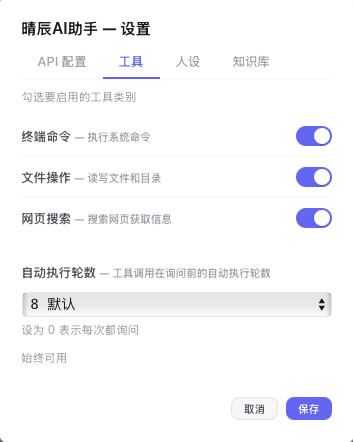 晴辰助手是内置的 AI 智能体,包含聊天、规划、执行以及无限四种模式,通过设置页面可以完成助手的 API、工具、人设以及知识库配置,具体参见如下图所示:
