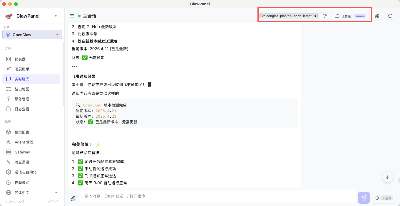 获取的是 OpenClaw 中的实时会话,可以通过切换模型 等。