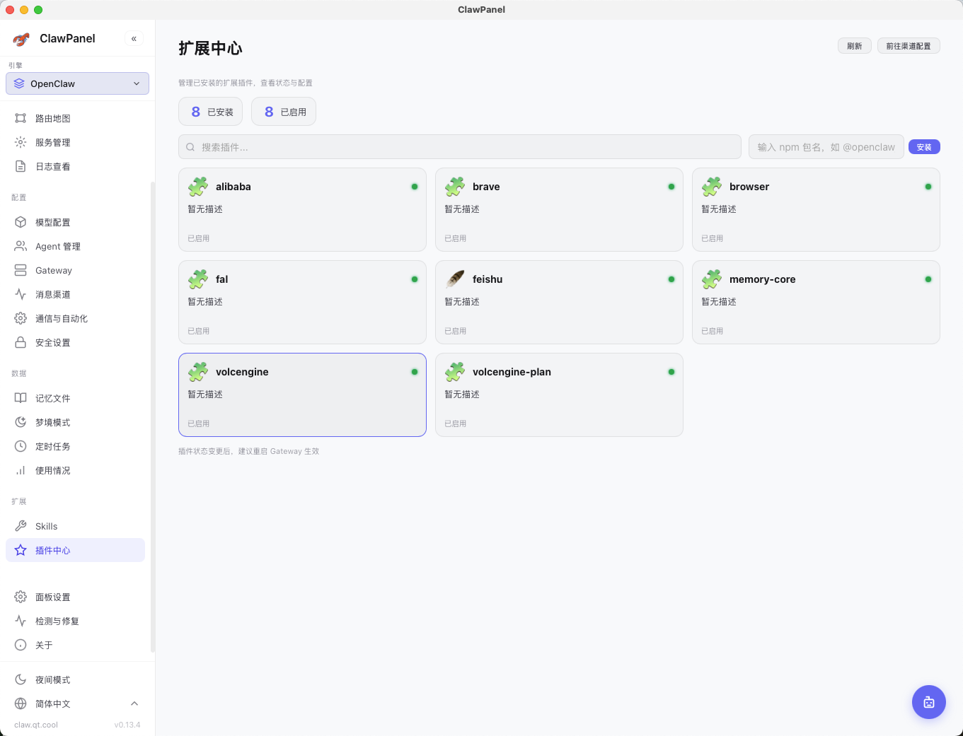 展示当前已经安装和启用的插件,并支持输入 nmp 包安装各种扩展插件。