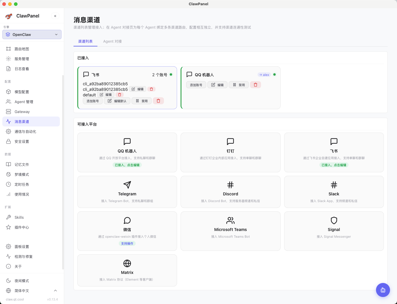 消息渠道主要包含渠道接入以及已接入渠道的信息配置,同时支持 Agent 与渠道的对接配置等。