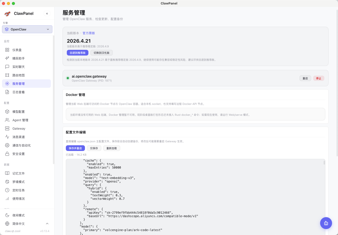 服务管理主要是 OpenClaw 应用服务的管理,包含当前版本、Docker 管理、配置文件编辑、配置校准以及配置备份等管理功能。