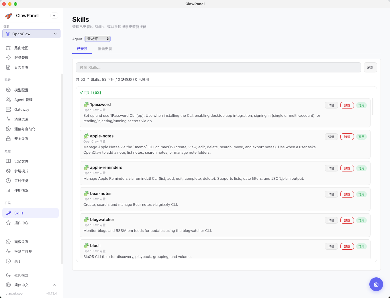 查看不同 Agent 的 Skills,也可以通过搜索给每个 Agent 安装 Skills :