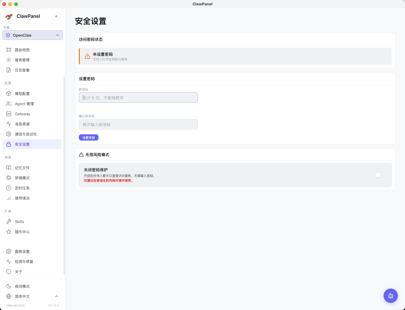 支持为面板设置密码,默认未设置,设置后需要输入密码确认后访问。