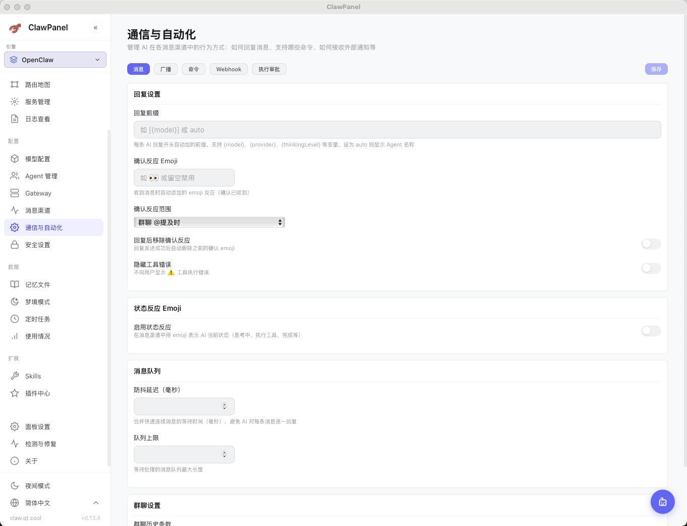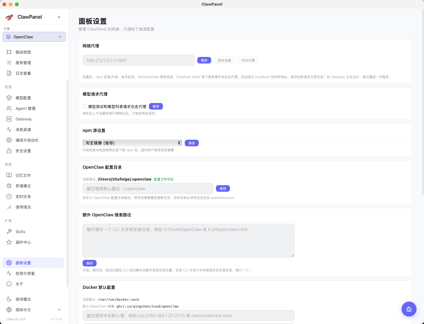 针对 ClawPanel 的面板设置,具体参见如下图所示。