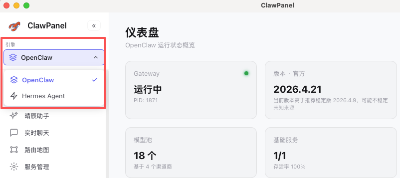 ClawPanel 如下图所示,通过安装部署可以自动接管本地部署的 OpenClaw 和 Hermes Agent,如下图为OpenClaw 接管后的效果图,可以将 OpenClaw 的 UI 界面更加直观清晰的展示出来,其中包含仪表盘、实时聊天、路由地图、服务管理、日志查看以及模型、Agent等相关配置信息。